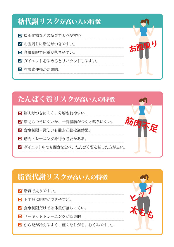 遺伝子検査で判明するのは、あなたの体が「何で太りやすいか」です。この情報をもとに、最適な食事バランスや運動法をご提案します。